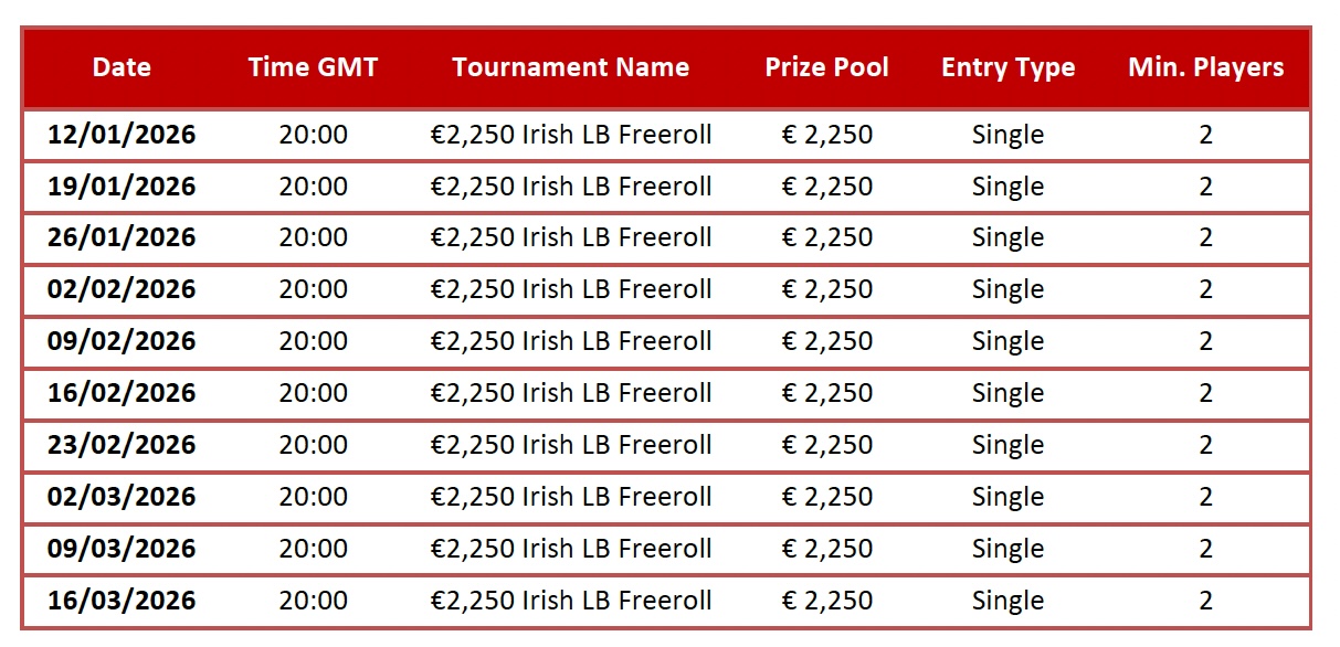 - The “€2,250 Irish LB Freeroll” tournament will be capped at 120 maximum entrants.