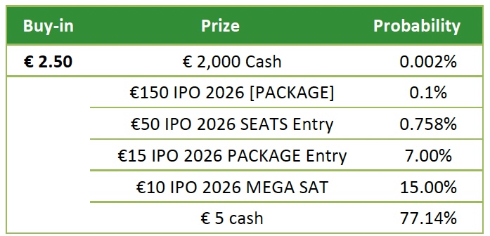 - The “€10 IPO 2026 MEGA SAT” ticket can be used “IPO PCKG MEGA|5x€150 GTD” events