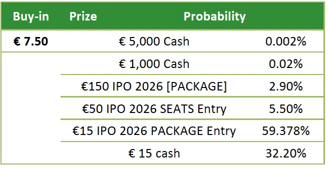 - The “€150 IPO 2026 PACKAGE Entry” tickets won can be used for any €150 buy-in “IRISH